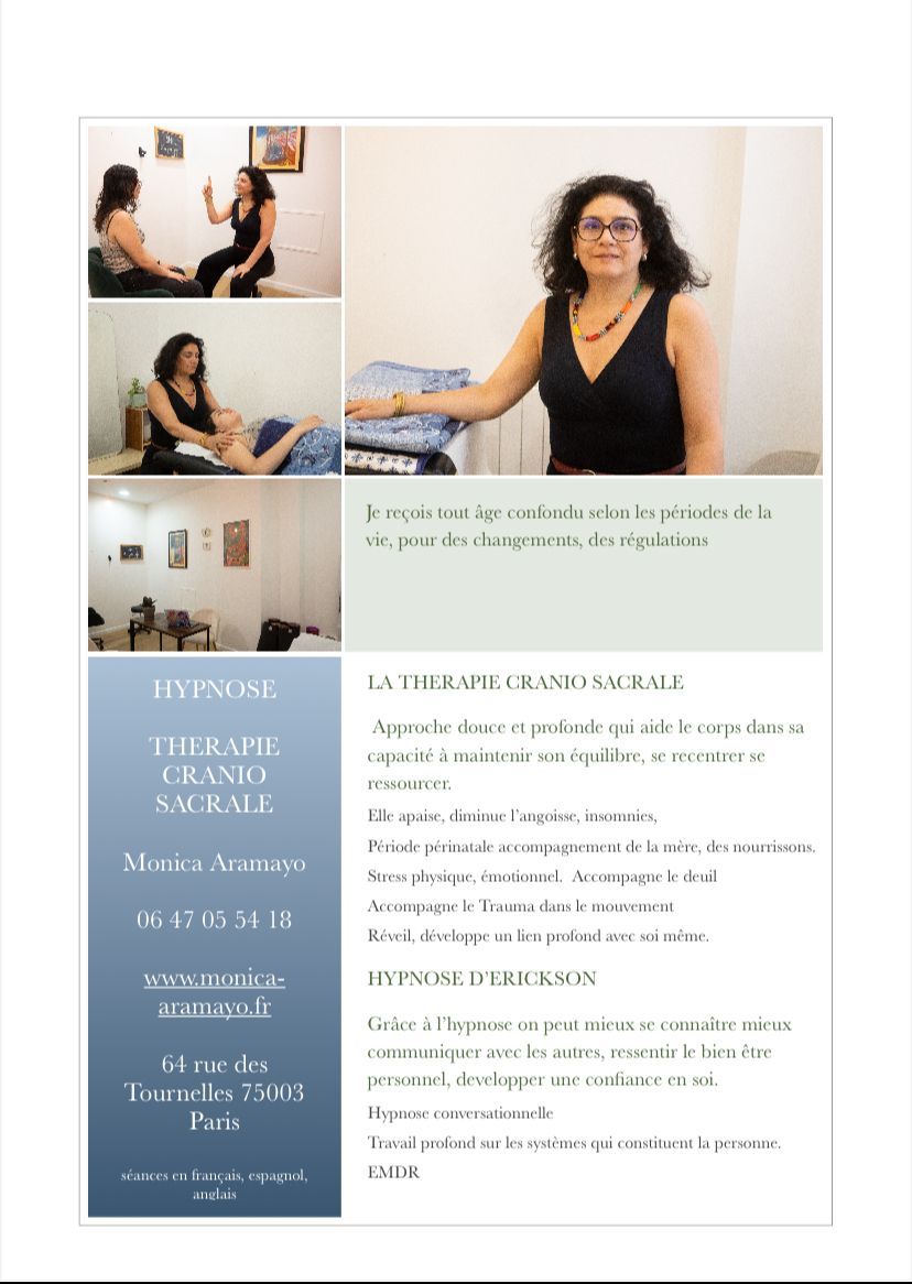 Découvrez l’Hypnose à Paris 3 avec Monica Aramayo : Une Approche Bienveillante pour Votre Bien-Être Si vous êtes à la recherche d'une méthode naturelle et puissante pour transformer votre vie et retrouver un équilibre intérieur, l'hypnose pourrait bien être la réponse que vous cherchez. Au cœur de Paris 3, Monica Aramayo propose une approche personnalisée de l’hypnose, adaptée à vos besoins et vos objectifs. Qu’est-ce que l’hypnose ? L’hypnose est un état naturel de concentration profonde, souvent comparé à une relaxation intense, dans lequel l’esprit devient plus réceptif aux suggestions positives. Contrairement aux idées reçues, il ne s’agit pas de perdre le contrôle de soi, mais plutôt d’accéder à un niveau de conscience qui permet de travailler sur des blocages, des habitudes ou des émotions difficiles. Avec Monica Aramayo, l’hypnose devient un outil puissant pour explorer votre inconscient et opérer des changements durables dans votre vie. Qui est Monica Aramayo ? Monica Aramayo est une praticienne expérimentée et passionnée par l’accompagnement des personnes en quête de mieux-être. Forte d’une formation rigoureuse et d’une écoute bienveillante, elle met son expertise au service de ses clients pour les aider à surmonter leurs défis personnels et professionnels. Basée dans le 3e arrondissement de Paris, Monica propose un cadre chaleureux et sécurisé pour vous accompagner dans un voyage intérieur transformateur. Les Bienfaits de l’Hypnose avec Monica Aramayo L’hypnose peut intervenir dans de nombreux domaines de la vie quotidienne. Voici quelques exemples où l’expertise de Monica peut vous être utile : Gestion du stress et de l’anxiété : Retrouver un état de calme et apprendre à mieux gérer les pressions du quotidien. Arrêt du tabac : Briser les habitudes de dépendance et adopter un mode de vie sain. Confiance en soi : Développer une estime de soi solide pour relever de nouveaux défis. Troubles du sommeil : Accéder à un sommeil réparateur et régénérant. Phobies et peurs : Se libérer des angoisses irrationnelles qui paralysent votre quotidien. Développement personnel : Exploiter pleinement votre potentiel et vivre en accord avec vos aspirations profondes. Chaque séance est adaptée à vos besoins spécifiques, Monica prenant le temps de comprendre vos attentes pour créer un programme sur mesure. Pourquoi choisir Monica Aramayo à Paris 3 ? Une approche humaine et bienveillante : Monica met un point d’honneur à offrir un accompagnement respectueux et non intrusif. Un cadre professionnel : Son cabinet est un espace propice à la détente et à l’introspection, au cœur du quartier dynamique de Paris 3. Des résultats concrets : Grâce à des techniques modernes et éprouvées, Monica vous aide à atteindre vos objectifs rapidement et efficacement. Comment se déroule une séance ? Une séance d’hypnose avec Monica Aramayo débute toujours par un échange. Cela permet de cerner vos besoins, vos objectifs et vos éventuelles appréhensions. Ensuite, Monica vous guide dans un état hypnotique en utilisant des techniques douces et progressives. Vous restez conscient tout au long de la séance et êtes acteur de votre propre transformation. À la fin de la séance, vous revenez naturellement à un état de vigilance normale, avec un sentiment de clarté et de sérénité. Prenez rendez-vous avec Monica Aramayo Si vous habitez Paris ou ses environs, et que vous souhaitez explorer les bienfaits de l’hypnose avec une praticienne de confiance, Monica Aramayo est là pour vous accompagner. Que ce soit pour des défis ponctuels ou un travail plus approfondi, elle saura vous guider sur le chemin du bien-être. Contactez Monica dès aujourd’hui pour prendre rendez-vous et commencer une nouvelle étape de votre vie. Hypnose à Paris 3 – Monica Aramayo : Transformez votre esprit pour transformer votre vie.